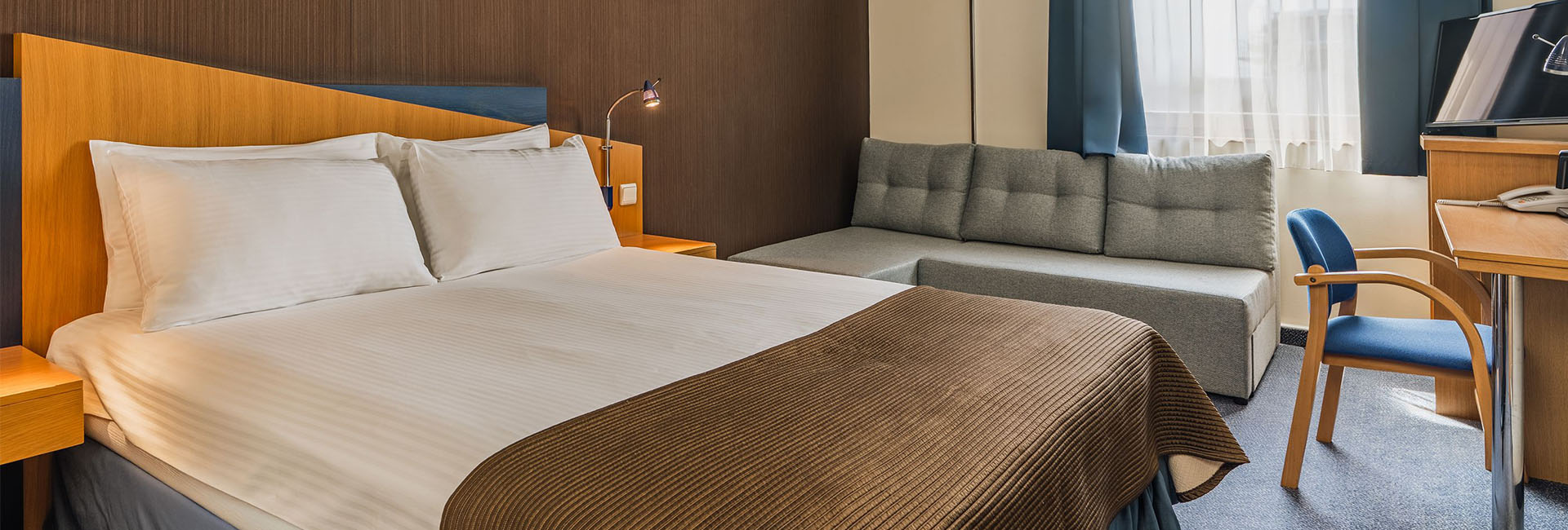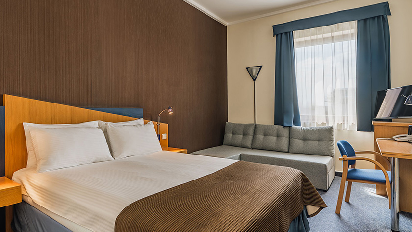 Do Państwa dyspozycji oddajemy 54 dwuosobowe pokoje z jednym podwójnym łóżkiem o szerokości 140 cm, w którym znajduje się również rozkładana sofa. Powierzchnia pokoju to ok. 20 m². Na życzenie Gości dostarczamy również łóżeczko dla dziecka. Funkcjonalne łazienki wyposażone są w kabiny prysznicowe, suszarki do włosów oraz ręczniki. Pokoje dostępne są wyłącznie dla osób niepalących.